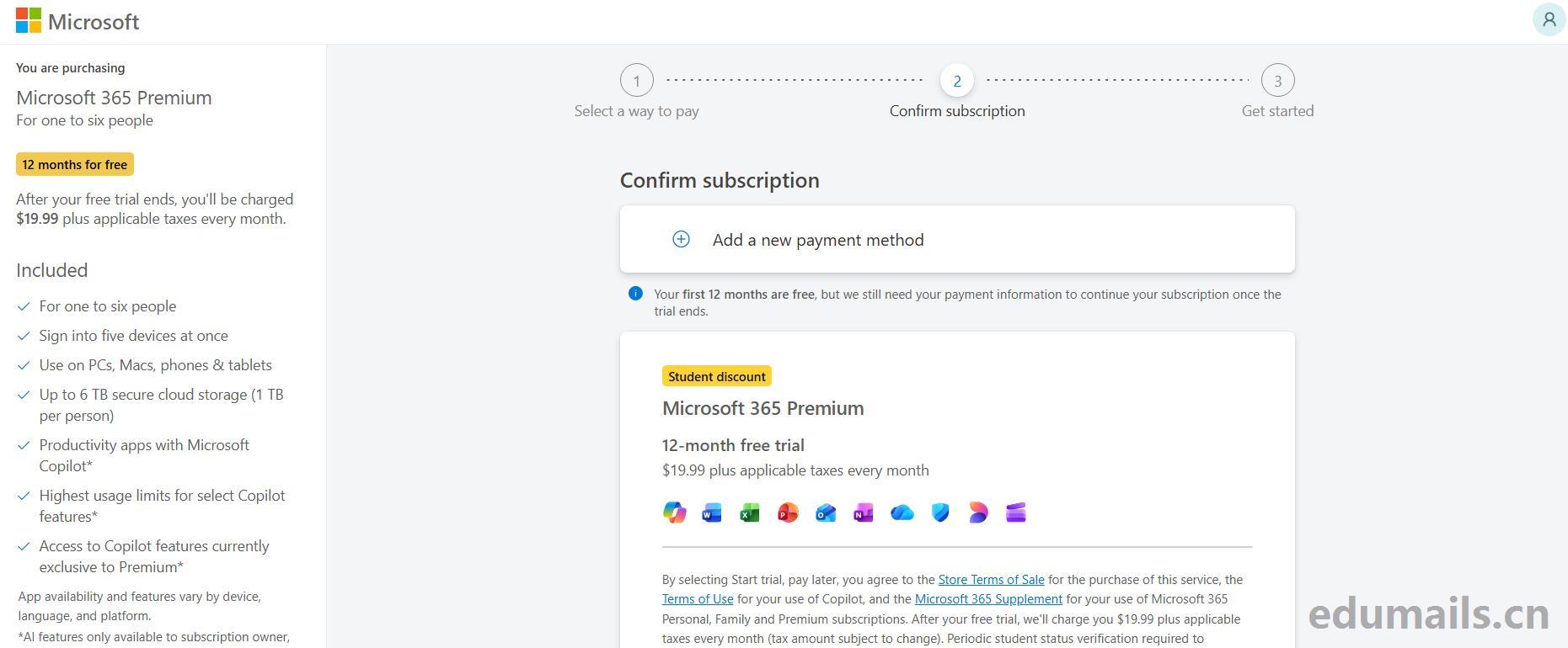 我们重新点击此次活动的官方链接https://www.microsoft.com/en-us/microsoft-365/college-student-pricing网址进入后,我们的下单页面提示,Your student status has been successfully verified 您的学生身份已成功验证。