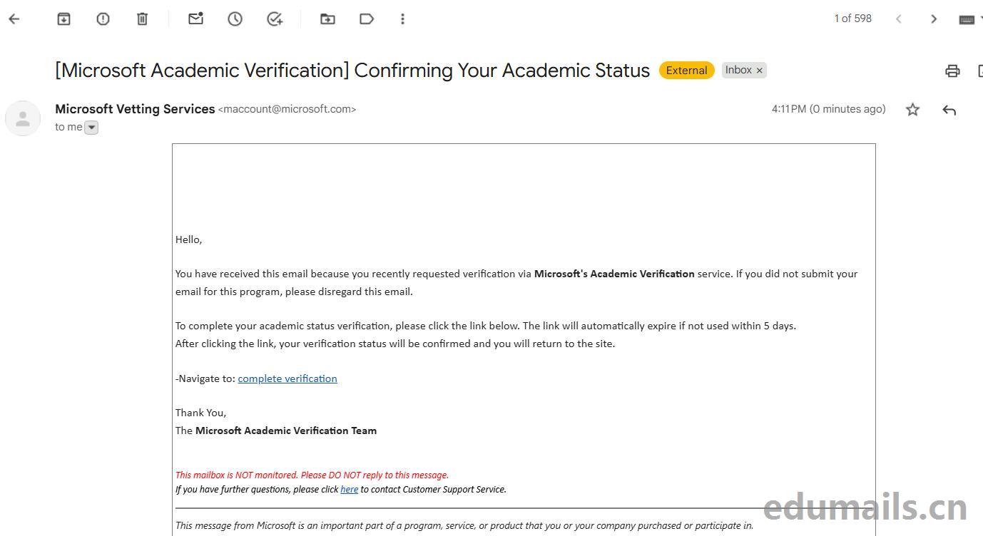 We received a letter titled "[Microsoft Academic Verification] Confirming Your Academic Status”微软官方邮件: