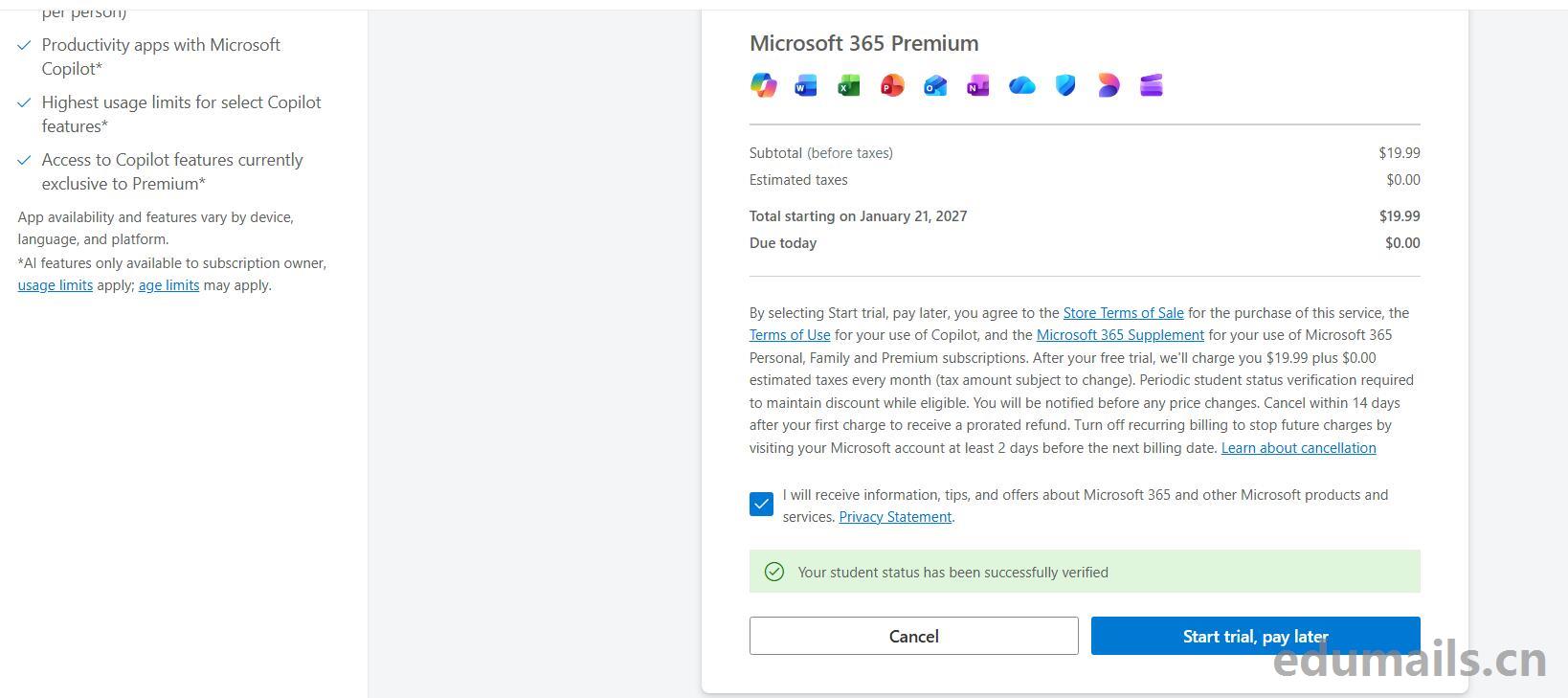 完成学生身份验证并结账后,您将获得为期 12 个月的 Microsoft 365 Premium 会员资格,并在 7 天内收到一封包含注册说明的电子邮件。请检查您的邮件过滤器和垃圾邮件文件夹,并尽快完成注册流程,因为本次促销活动中 LinkedIn Premium Career 的名额有限。