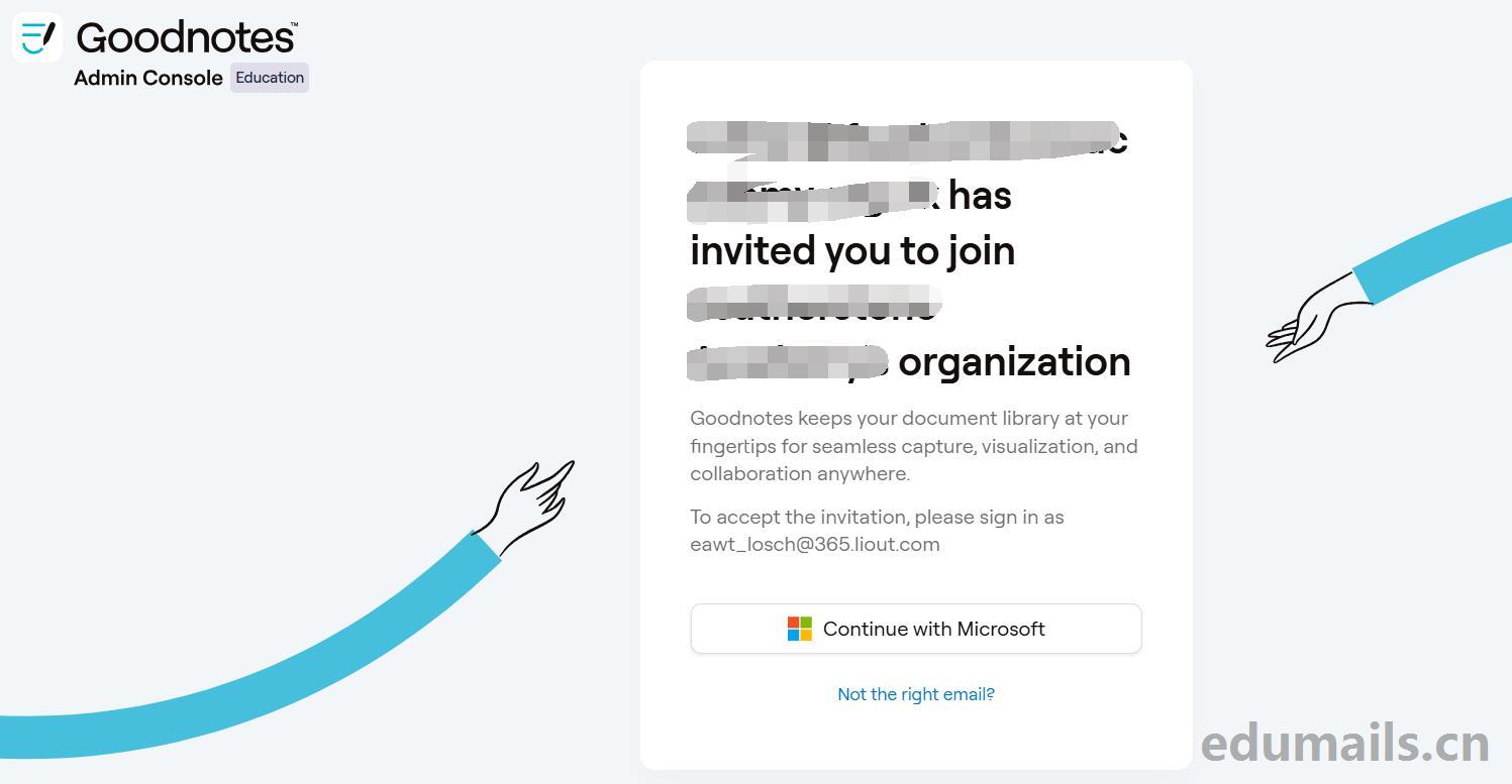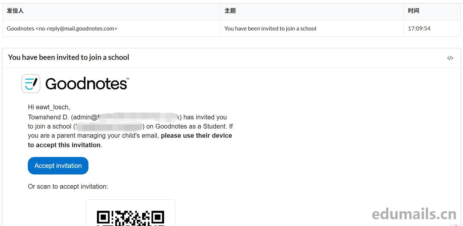 Townshend D. 邀请您以学生身份加入 Goodnotes 上的 XXXXXX学校。如果您是管理孩子电子邮件的家长,请使用孩子的设备接受此邀请。