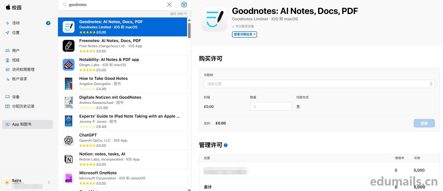 我们直接登陆苹果校园教务管理后点击网页左下角“App和图书”功能,我们在搜索框输入Goodnotes,然后进行许可证购买,我们任意输入想要的数量,如下图所示: