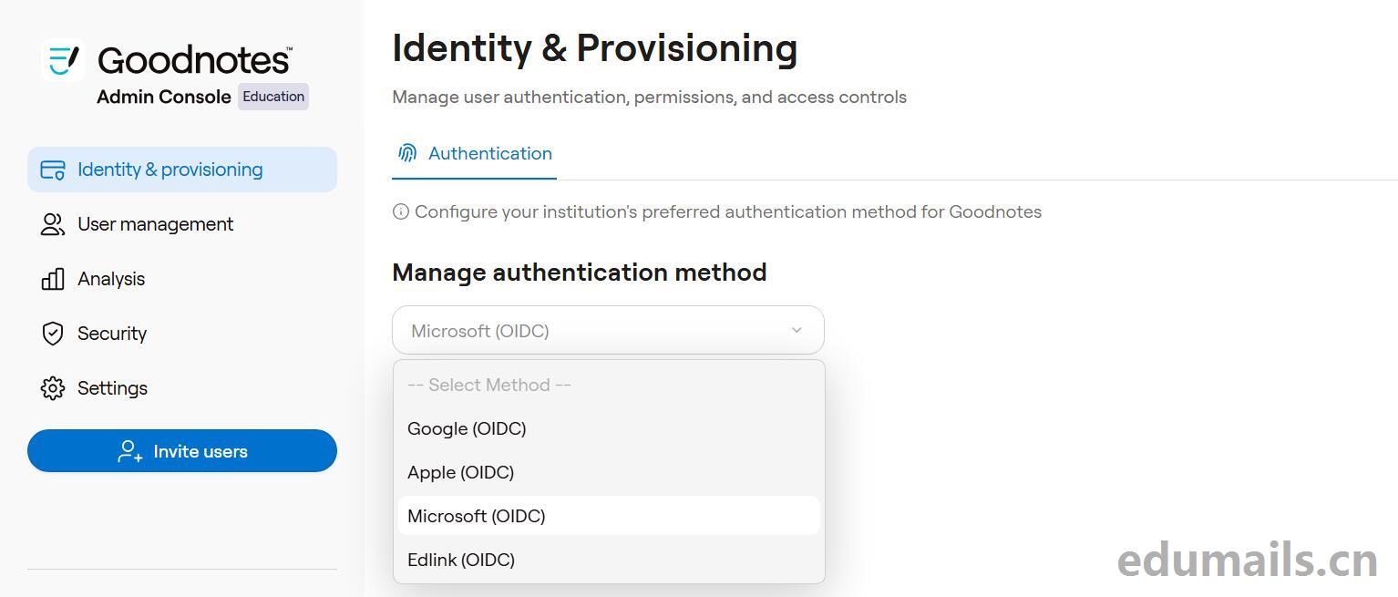 Identity & provisioning身份和配置,意思是允许用户的邮箱地址类型,比如要求是对方是谷歌或者苹果或者微软邮箱的形式才允许登陆Goodnotes教育版.