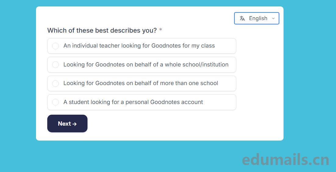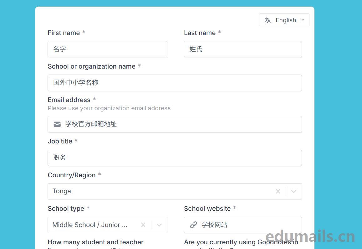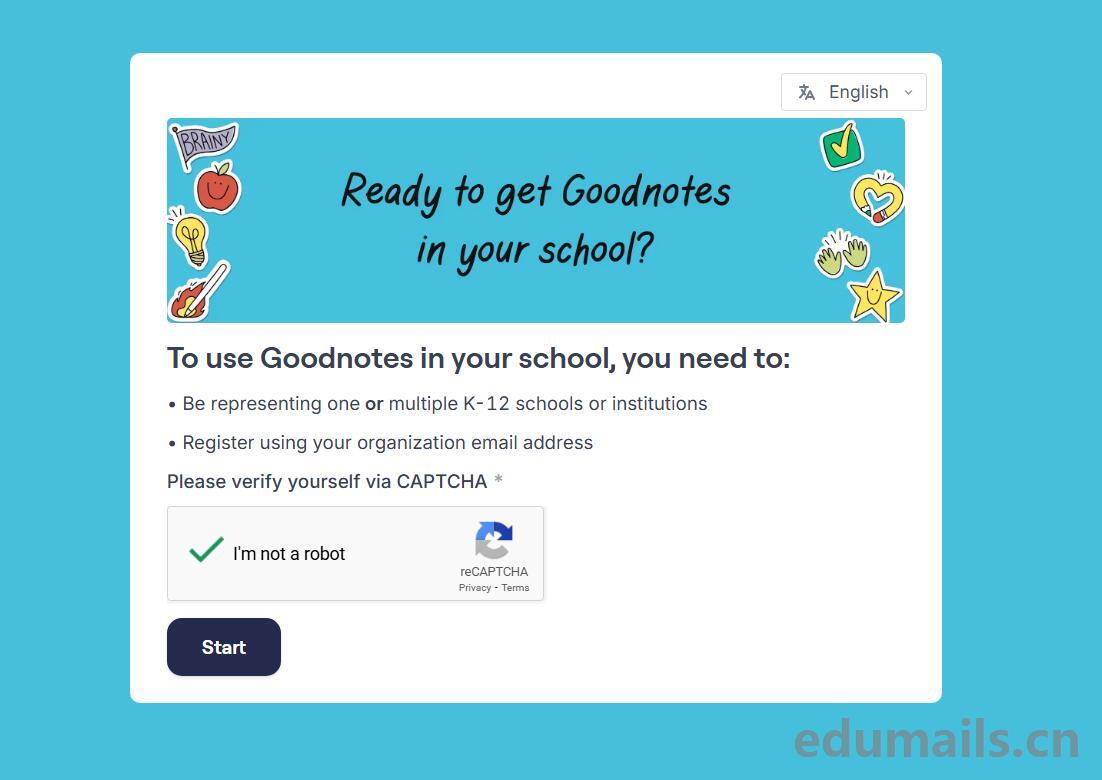 该方式是填写表单形式:我们打开Goodnotes Education官方说明页面https://www.goodnotes.com/education然后点击Get started即可跳转到表单填写部分:表单地址https://education.goodnotes.com/register 如下图所示: