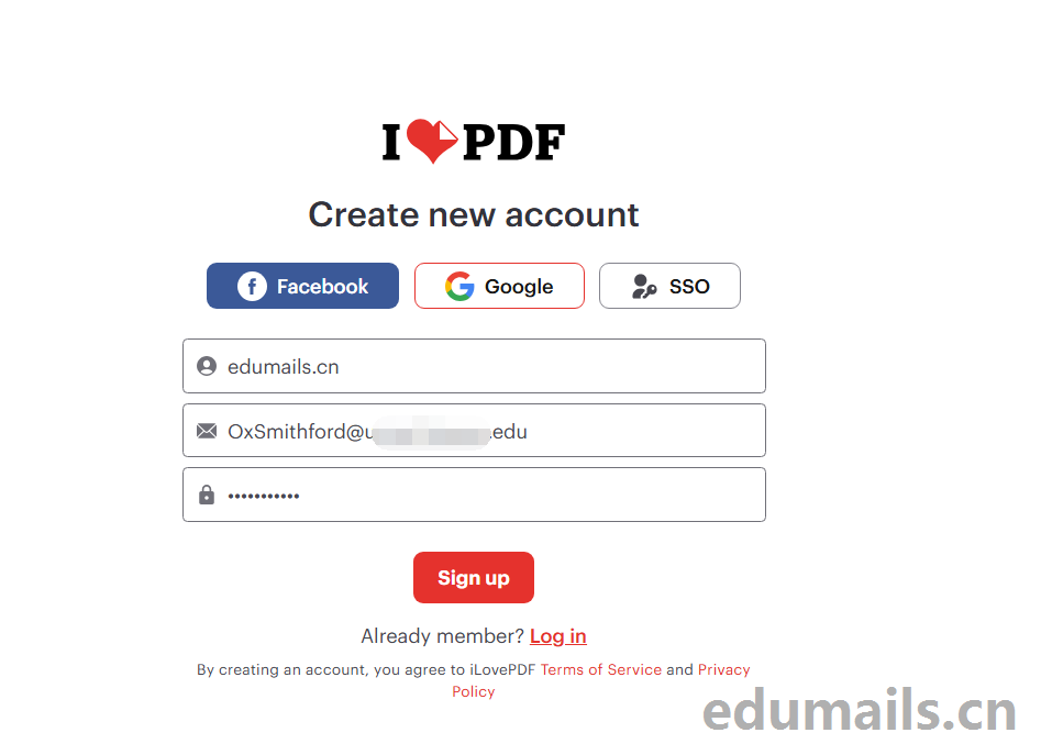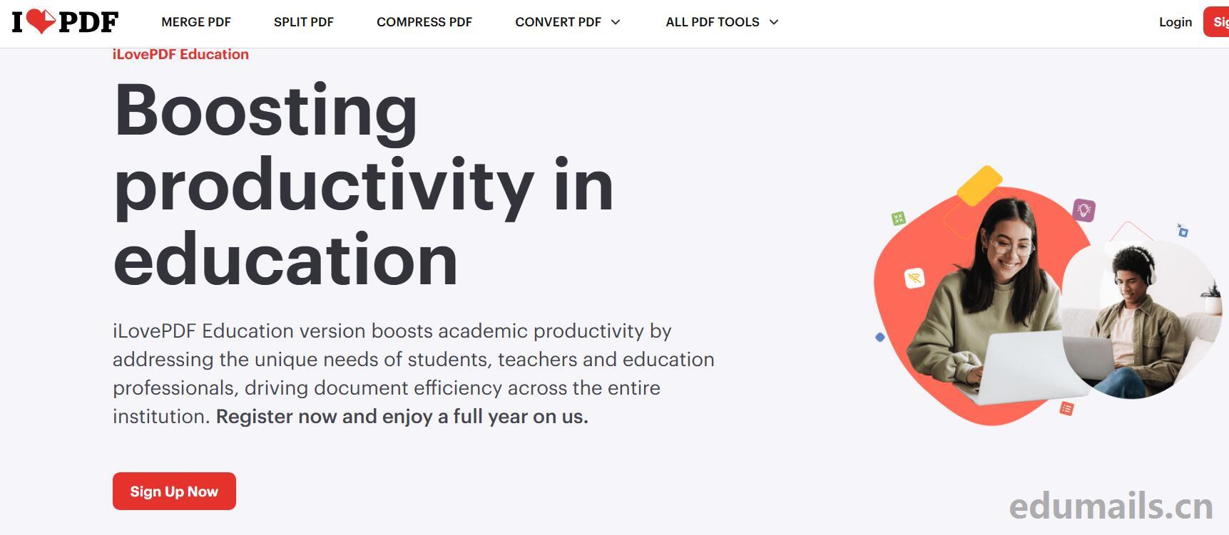 根据教育计划要求,我们直接用美国edu邮箱注册ilovepdf来获得学生计划,我们直接打开上图教育计划图片中Sign Up Now