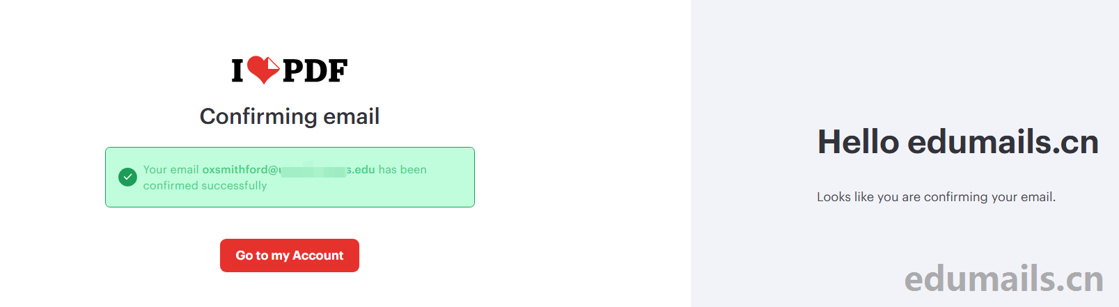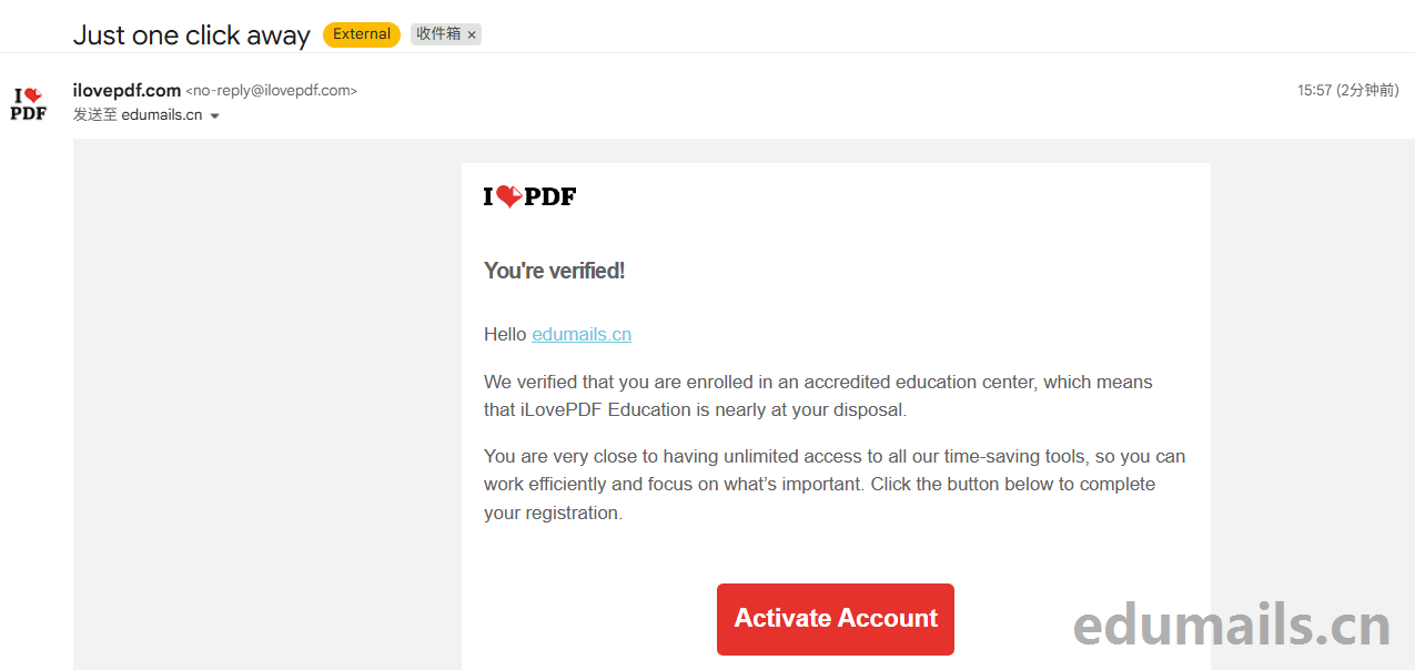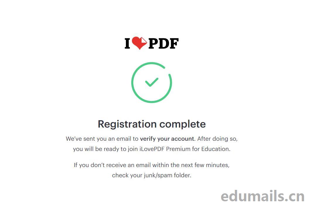 You’re verified! Hello edumails.cn,We verified that you are enrolled in an accredited education center, which means that iLovePDF Education is nearly at your disposal. You are very close to having unlimited access to all our time-saving tools, so you can work efficiently and focus on what’s important. Click the button below to complete your registration.