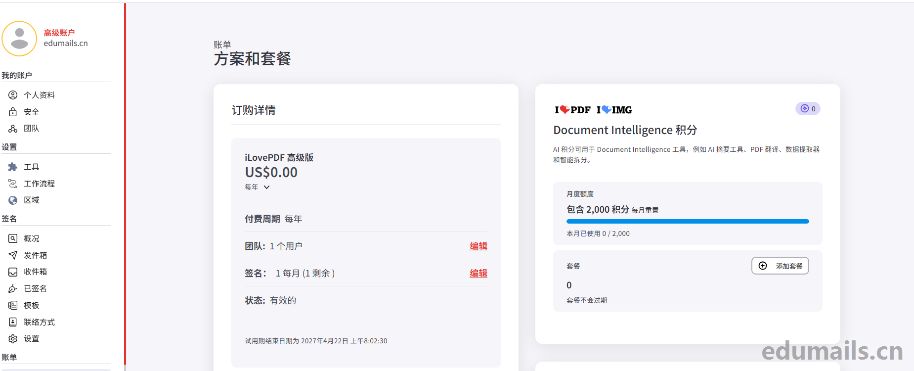 我们进入ilovepdf的用户中心如下图所示,点击网页左下角计划查看到,https://www.ilovepdf.com/user