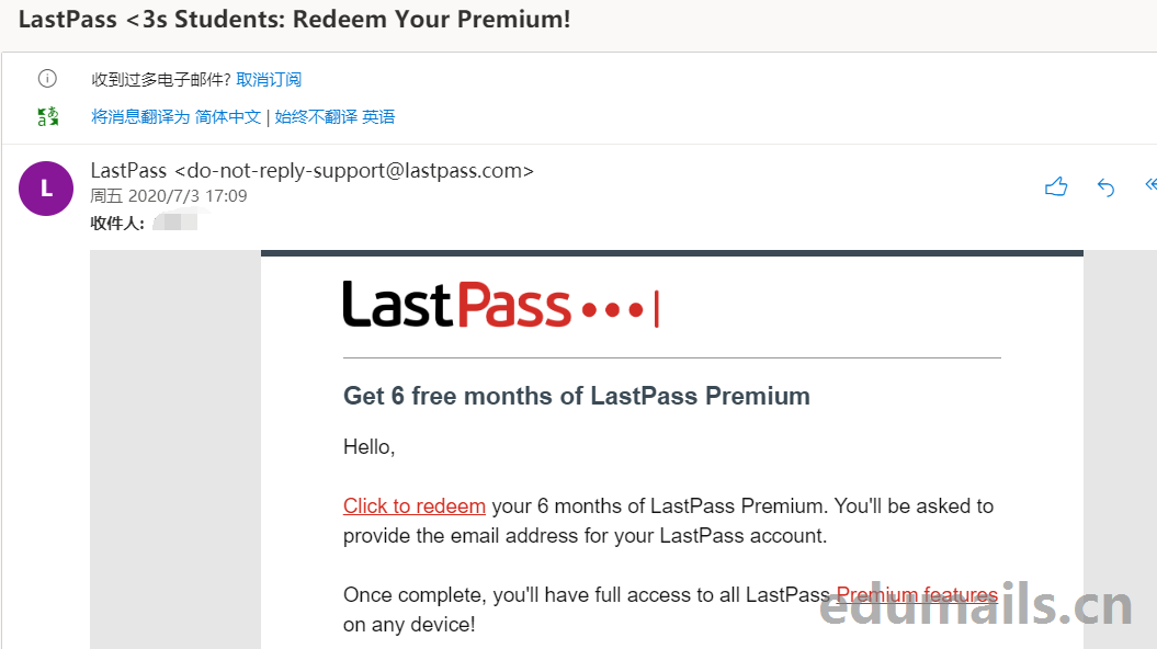 兑换该会员之前要注册一个LastPass账户,本站为了方便直接用edu邮箱注册的,登陆状态下点击edu邮箱邮件里面的兑换即可搞定。