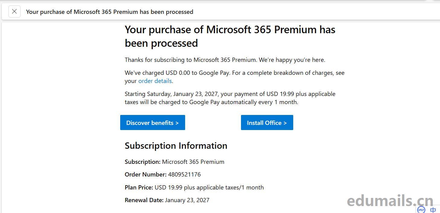 我们重新点击此次活动的官方链接https://www.microsoft.com/en-us/microsoft-365/college-student-pricing网址进入后,我们的下单页面提示,Your student status has been successfully verified 您的学生身份已成功验证。