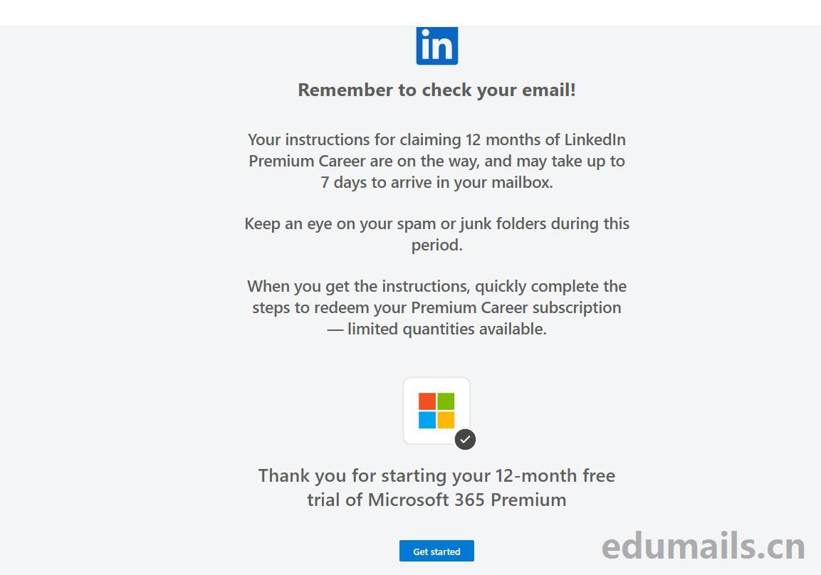 Your instructions for claiming 12 months of LinkedIn Premium Career are on the way, and may take up to 7 days to arrive in your mailbox.领取 12 个月 LinkedIn Premium Career 的说明正在发送途中,可能需要最多 7 天才能到达您的邮箱。