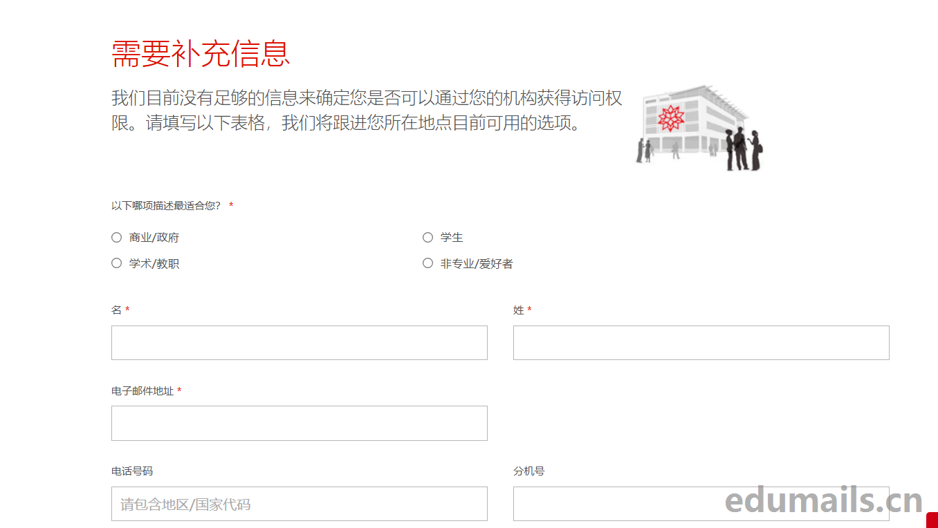 需要补充信息,我们目前没有足够的信息来确定您是否可以通过您的机构获得访问权限。请填写以下表格,我们将跟进您所在地点目前可用的选项。