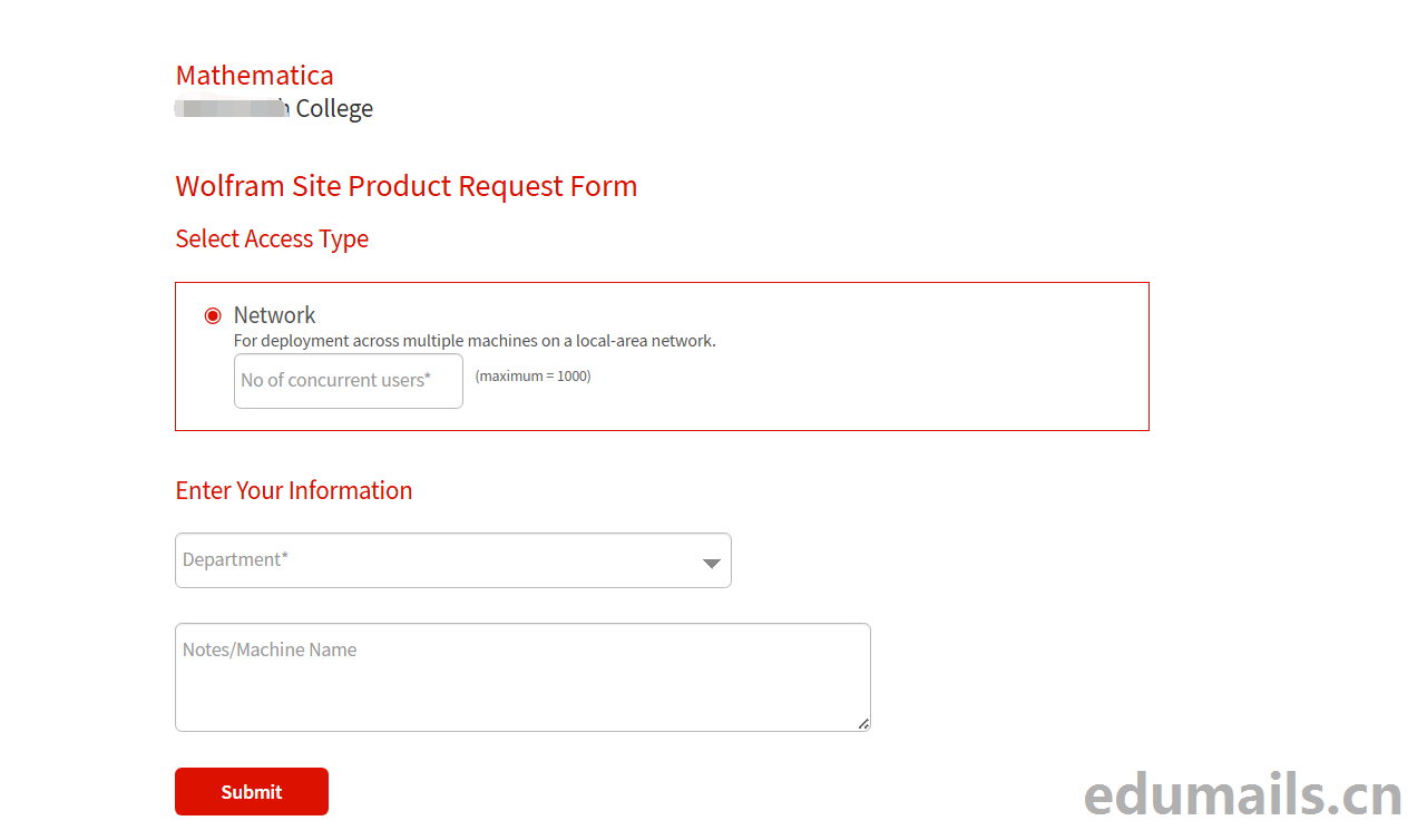 Wolfram Site Product Request FormWolfram 网站产品申请表、Select Access Type选择访问类型。